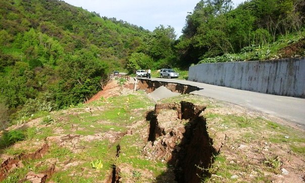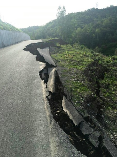 На участке, где ранее наблюдался сход суглинистого грунта, произошло дальнейшее обрушение дороги и сход оползня.