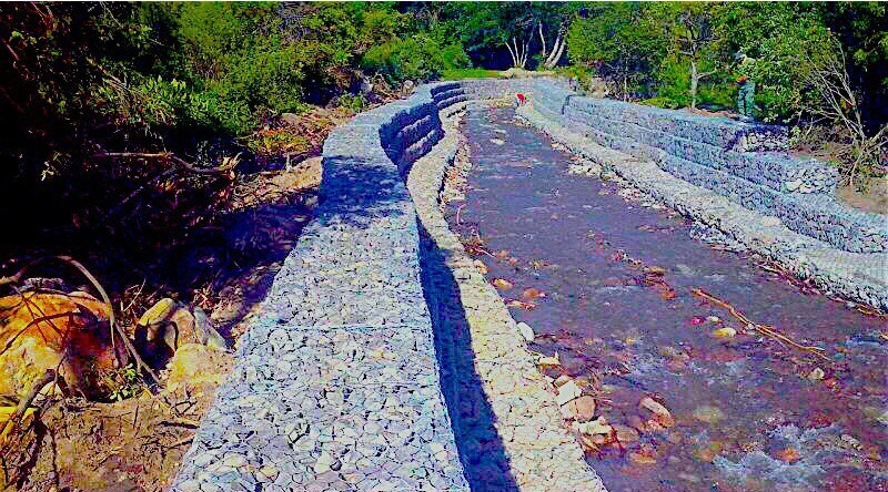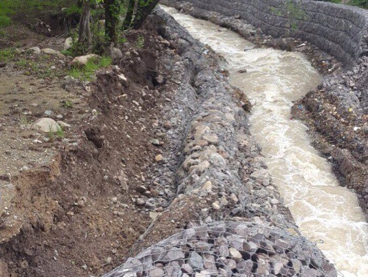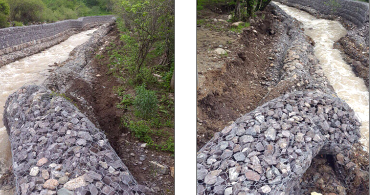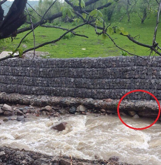 2.На данном объекте не был применен геотекстиль. Строительство габионов без применения геотекстиля считается грубейшим нарушением в области строительства. В сооружении габионных конструкций должен применяться иглопробивной геотекстиль плотностью не менее 240 гр/м2. Геотекстиль служит обратным фильтрам для габионой конструкции, что предотвращает проникновение мелких частиц грунта.