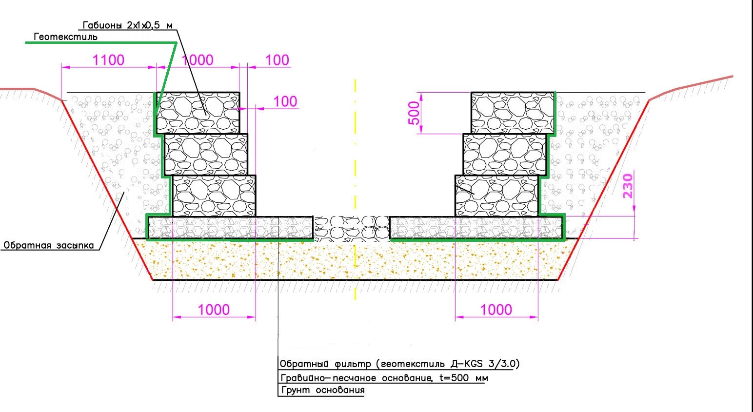 В зоне контакта с обратной засыпкой, а также по основанию габионов должен укладываться обратный фильтр из нетканого иглопробивного геотекстиля по слою песчано-гравийной (щебеночной) подготовки толщиной 0,15-0,30м. На горных участках рек, на основаниях из гравелисто-галечниковых отложений, должен укладываться слой подготовки из крупных камней фракцией более 40 мм.