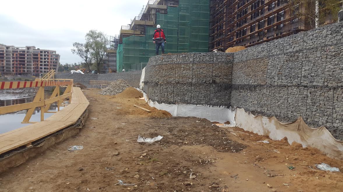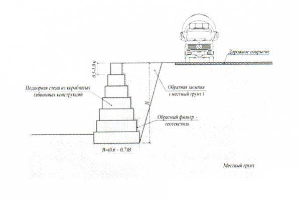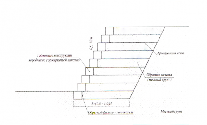 - Обратную засыпку задней грани стены габионного сооружения, рекомендуется выполнять из несвязных водопроницаемых грунтов, в соответствии с требованиями СНиП 2.06.07;