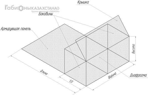 Габион с армирующей панелью представляет собой конструкции заводского изготовления по СТ РК ГОСТ Р 52132-2008 и ТУ 14-178-350-98, выполненные из металлической сетки двойного кручения с шестиугольными ячейками, разделенные на секции при помощи диафрагм (рис. 1, 2), устанавливаемых внутри лицевой грани через каждый метр по ширине.